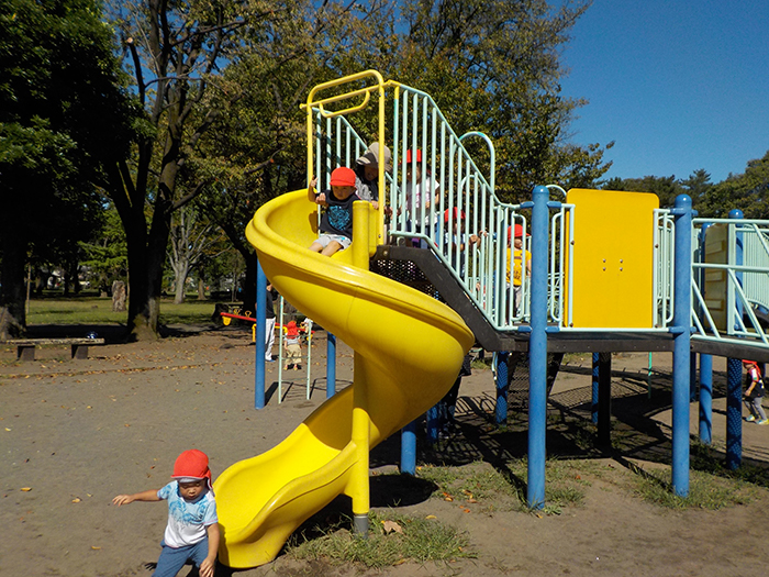 2歳児クラスが保育園バスに乗り、若草公園に行ってきました。 すべり台を何度も滑り、大喜びの子どもたちでした。
