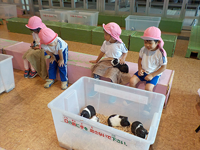 モルモットがおうちに帰ります。ベルの合図でみんながお家に向かいます。 「可愛い~!」声が上がっていました。