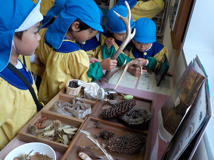 ビジターセンターでは、御岳の自然について教えてもらいました。 鹿の角にはみんなびっくりしていました。