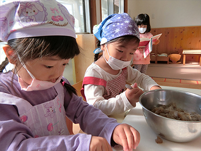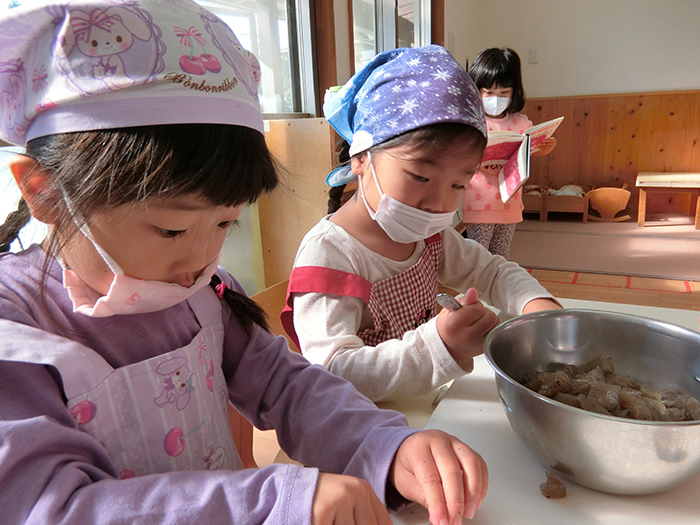 4歳児が芋煮会の芋煮に入れる、こんにゃくをスプーンでちぎってくれました。