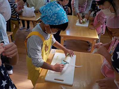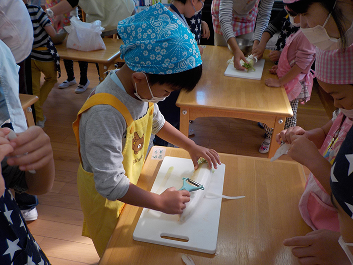 5歳児は野菜の皮むきと野菜切りをしてくれました。真剣な表情で取り組んでいました。