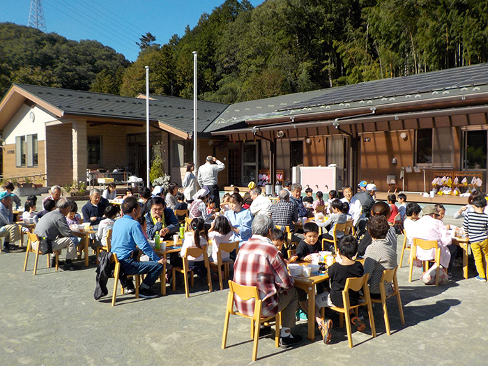 作った芋煮を園庭で食べました。良い天気で外での食事は雰囲気が変わりみんな喜んでいました。