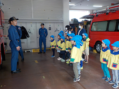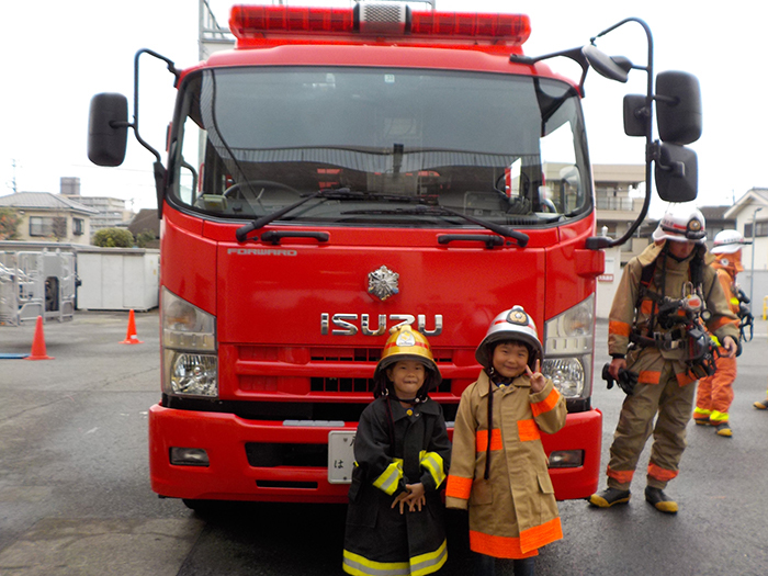 消防士さんの服を着せてもらい、消防自動車の前で記念撮影をさせてもらいました。