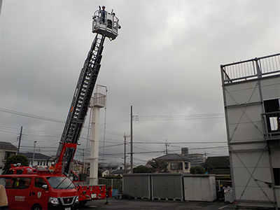 はしご車に担任が乗せてもらいました。「先生―大丈夫―!!」みんな心配な様子でした。