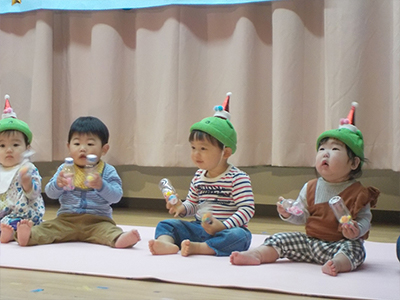 発表会です。0歳児クラスのお友だちが、手作り楽器のマラカスを持って、シャカシャカ!! とても上手でした。