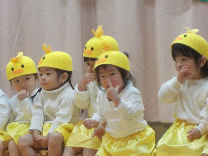 1歳児クラスのお友だちが「ぶー!!」とぶたさんかな?保育園でやっている手遊びを披露してくれました。