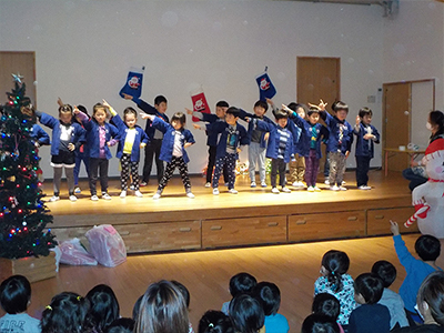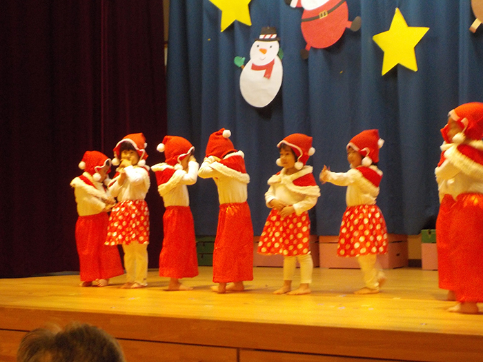 サンタさんの衣装で登場してくれたのは2歳児クラスです。可愛らしい衣装でした。
