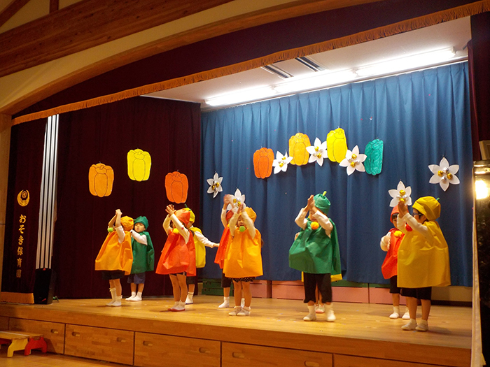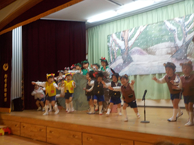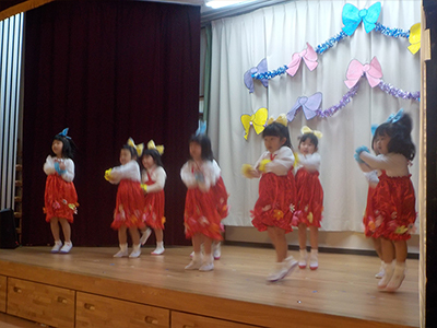 4歳児クラスはもう一つ。♪ぼんぼんりぼん♪と可愛らしい衣装を着て飛び跳ね元気に踊ってくれました。