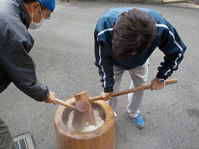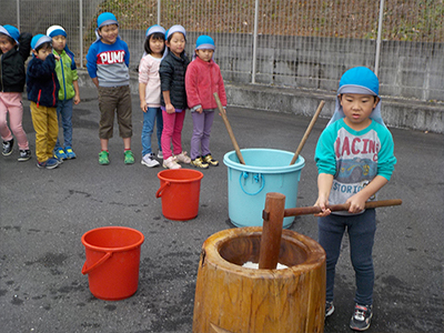 年長児は重たい杵を持って、お餅つきを体験しました。