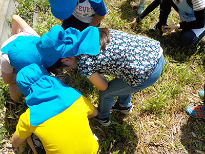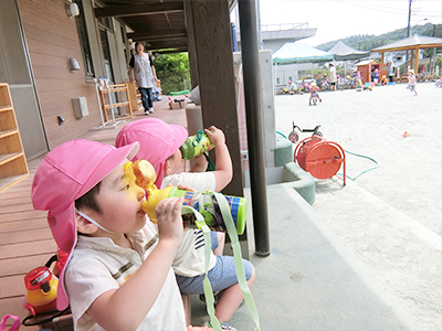 疲れた子どもたちはひと休み!水筒のお茶を一気飲み・・・かな?