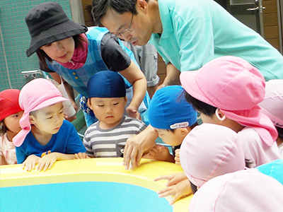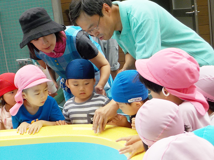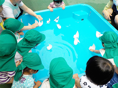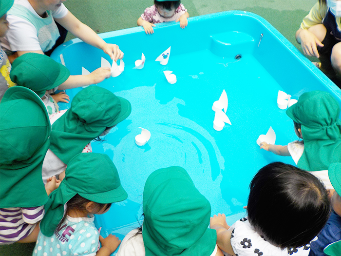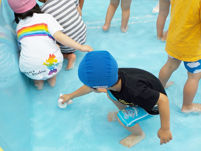 今日からプールが始まります。小さいクラスもお舟を浮かべて楽しみました。