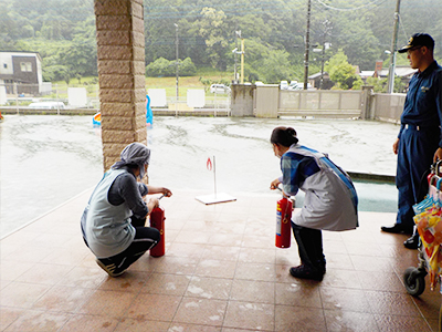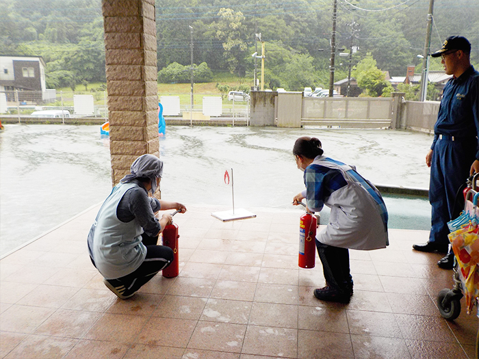 職員は消火器の使い方を教えてもらい、実際に使ってみました。ちょっと緊張でした。
