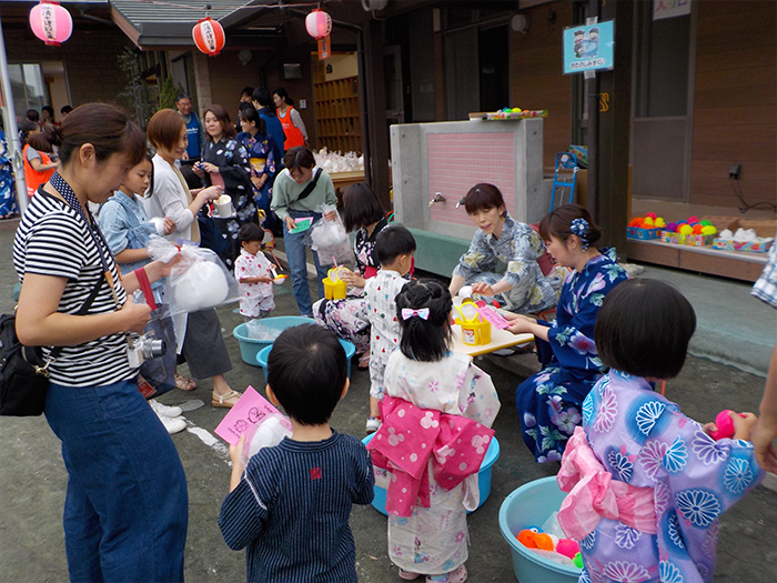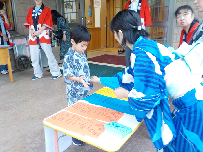 受付でチケットを貰い縁日のお店を回ります。何屋さんがあるかな?