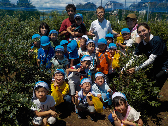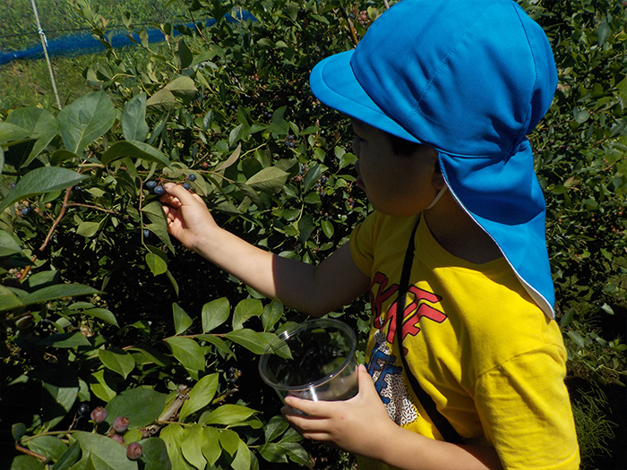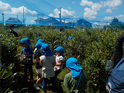 ブルーベリー畑へやってきました。 声を掛けて頂き、5歳児クラスがブルーベリー摘みをさせて頂きました。