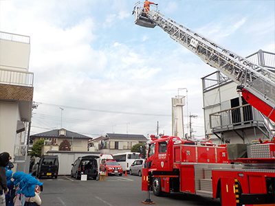 はしご車がぐんぐん空へあがっていくのを見てみんなすご~い!声をあげていました。