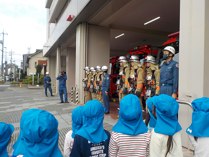 火事の時の出動の様子も見せてくれました。洋服を素早く着て重たい酸素を背負って・・・。 準備が早くてびっくりしました。 ページを閉じる