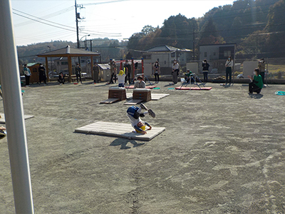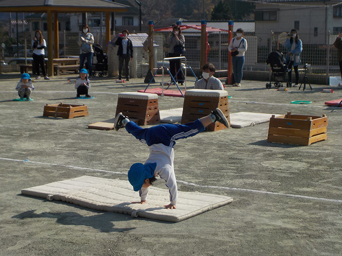 年長さんになるとマットで側転をしました。他にも平均台・鉄棒・とび箱も披露しました。