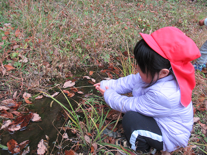 水たまりに草の棒を垂らして釣りかな??