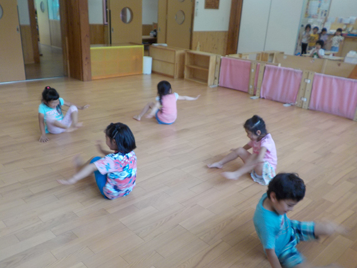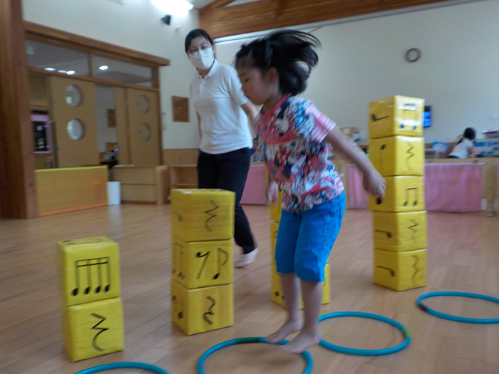 6月から外部講師の指導を再開しました。今回は、音感保育の様子をお伝えします。間隔を空け、少人数での参加です。