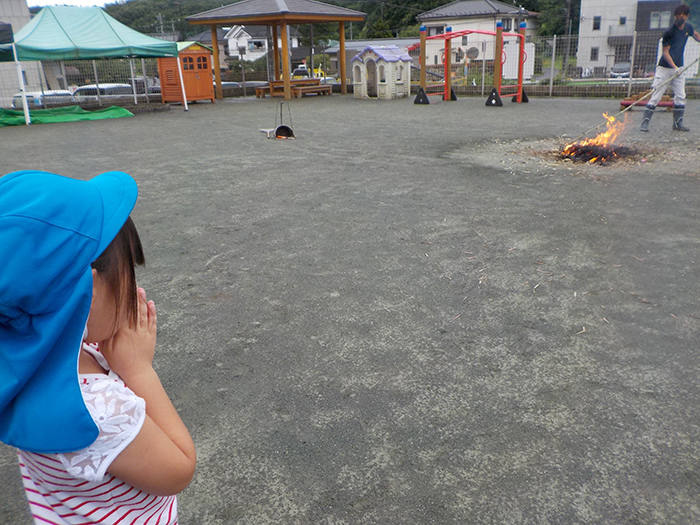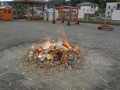 笹を燃やし始めると煙が空へ!みんなの願いが届くといいな。
