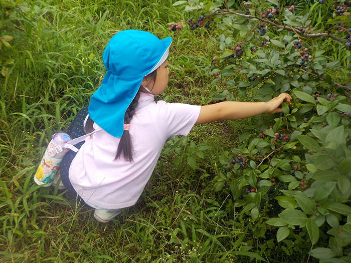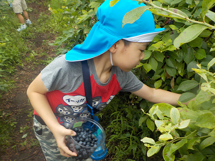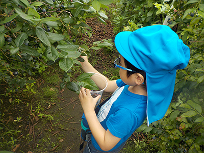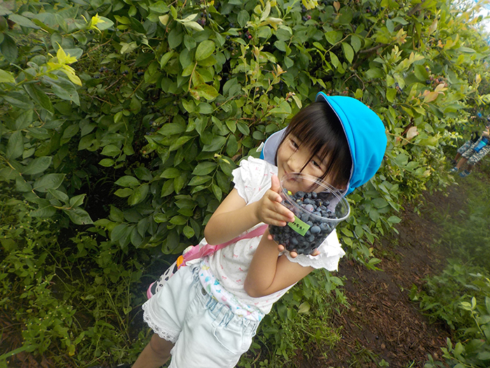 もらったカップいっぱいにブルーベリーを入れようと張り切って摘んでいました。