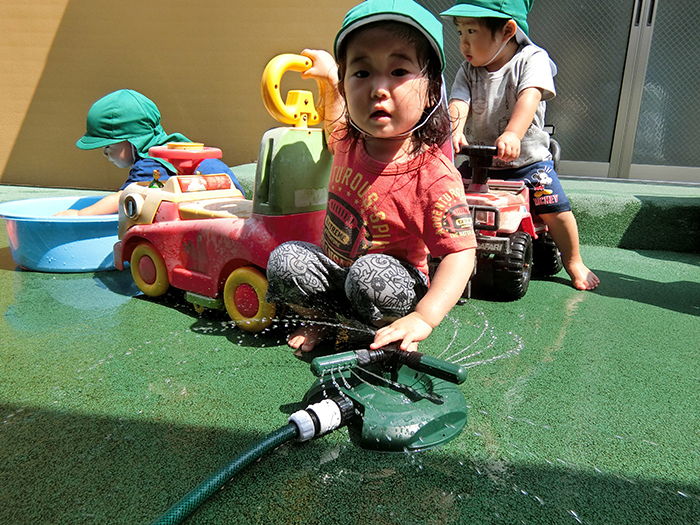 ホースから出てくる水がくるくる回り・・・。回っている水に手を伸ばしていました。