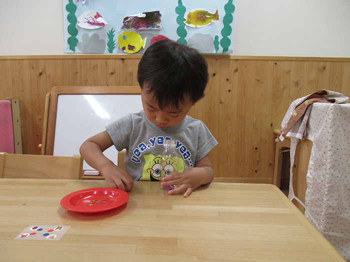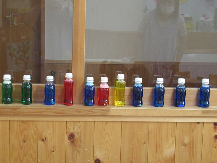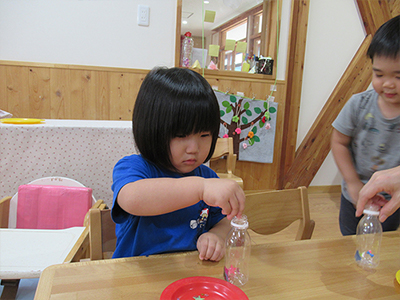 ペットボトルを動かすと中のキラキラも動いて・・・。きれい~!喜んで動かしていました。