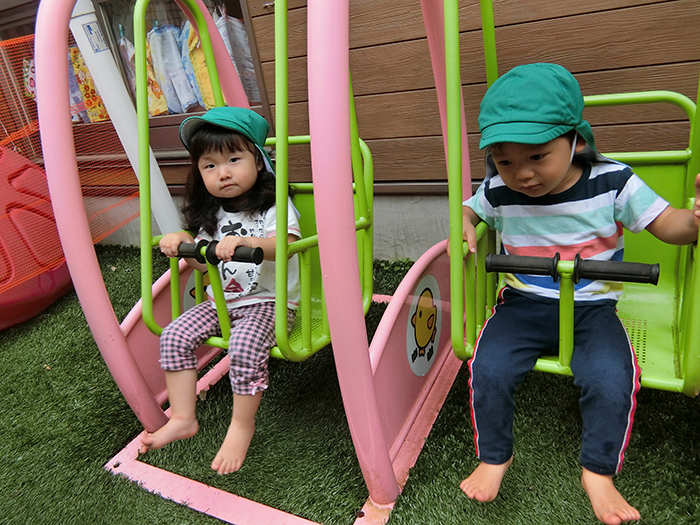 1歳児クラスです。中庭のブランコでゆらゆら…。のんびり時間が流れます。