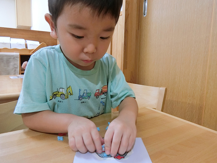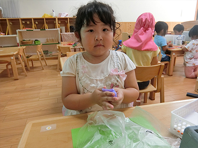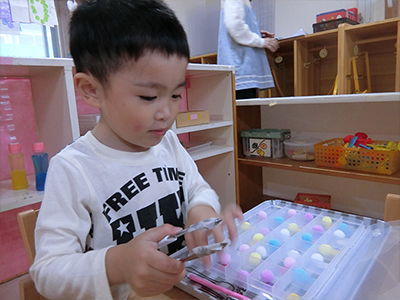 3歳児クラスです。ふわふわボールを一つずつ掴んで入れます。集中していました。