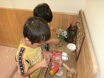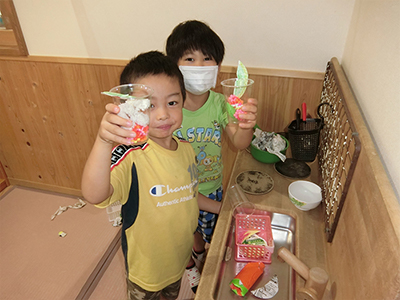 4歳児クラスです。暑い日、ジュース屋さんがオープンしていました。