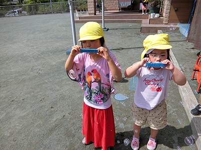 園庭では小さいシャボン玉がたくさん空に飛んでいきました。