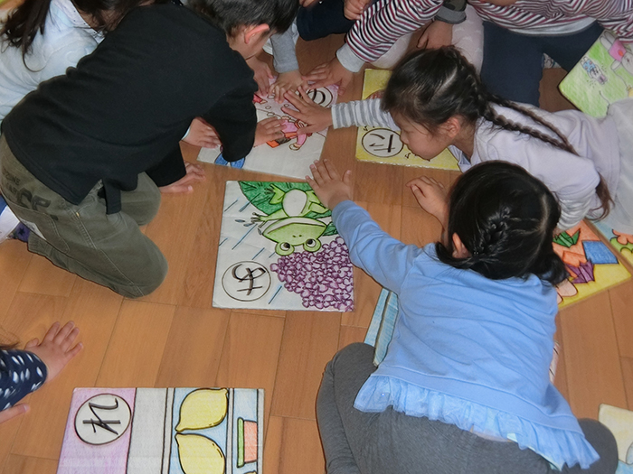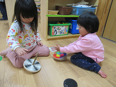 大きなこまなので小さいクラスの子も回せて、回った時の模様を楽しんでいました。