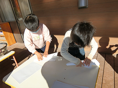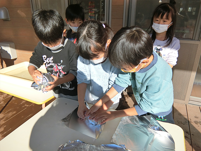 紙でくるんでホイルで巻いて・・・年長さんがお手伝いしてくれました。