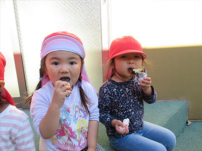 2歳児クラスは裏庭で焼き芋を食べました。