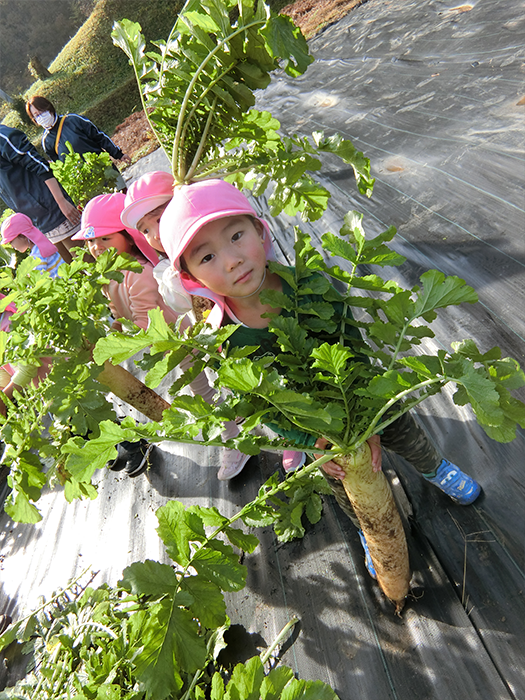 おもたいよー!3歳児クラスも収穫体験しました。