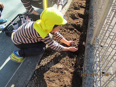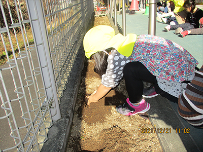 可愛い花が咲きますように・・・。4歳児がチューリップの球根を植えました。 。