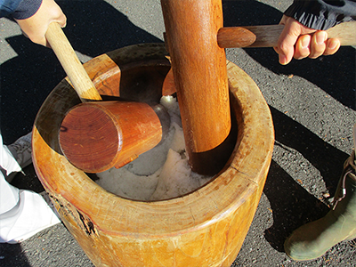 大きな臼と杵でもちつきです。コロナ禍の今は鏡餅用のおもちをつきました。