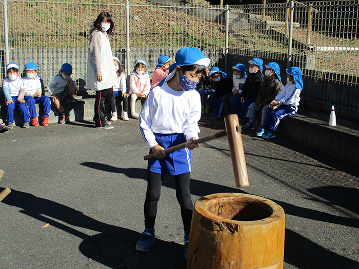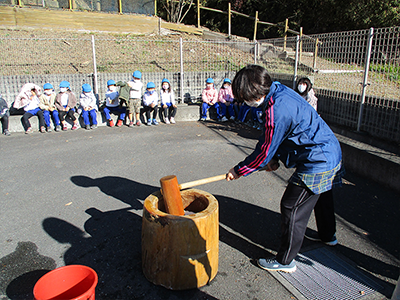 年長児が餅つき体験です。杵を持ち「おもたーい!」でも頑張ってついてくれました。