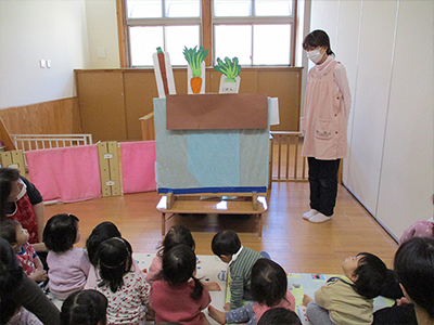 先生から子どもたちへペープサートのプレゼントです。みんなよく見てくれました。
