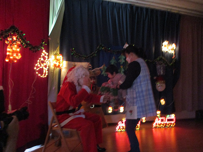 サンタさんからプレゼントをもらいました。0歳児のお友だちもサンタさんをジーッとよく見ていました。