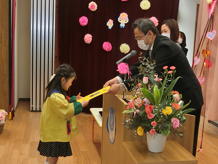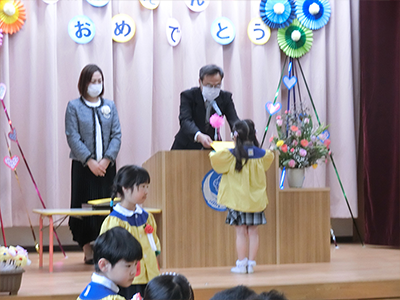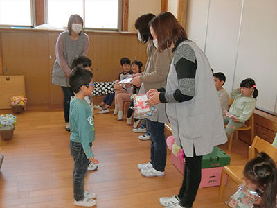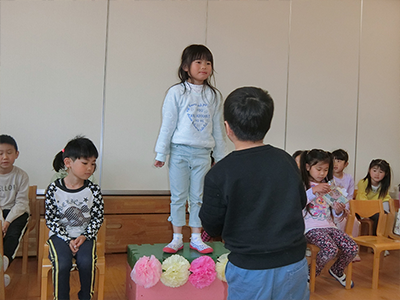 みんなのいいとこ発表会!一人ひとりが主役です。小学校へ行ってもがんばってね!4歳児からプレゼントを渡しました。
