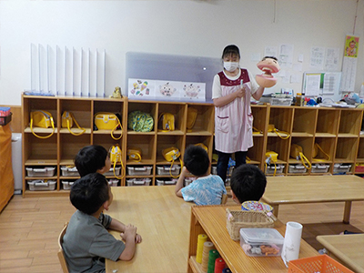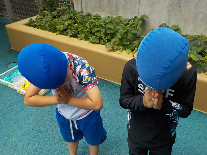 年長さんが代表で「みんなが怪我なく、楽しくプールができますように…。」お祈りをしてくれました。