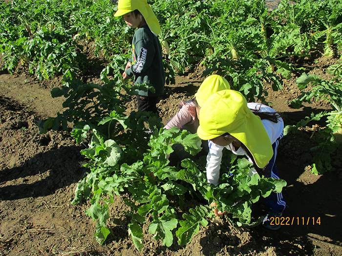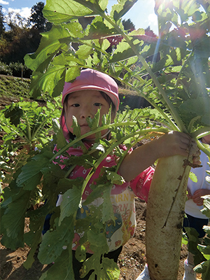11月は収穫物がたくさんです。こんなに大きな大根で「重たーい!」必死に持っていました。