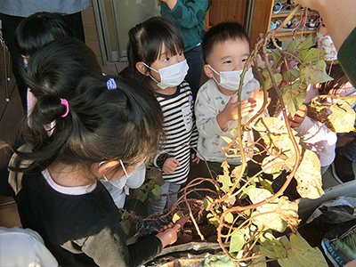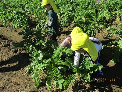 3・4・5歳児が順番に掘ってくれました。自分たちで掘った大根をお持ち帰り!どんな料理になったかな?
