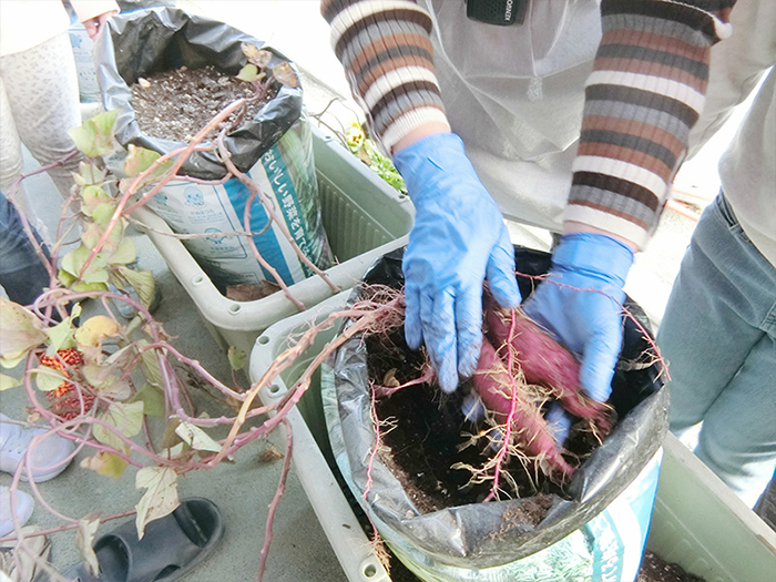土の入った袋の中で育てていたさつまいもを収穫しました。