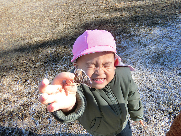 葉っぱにも霜がついていて「冷たーい!」いい表情です。