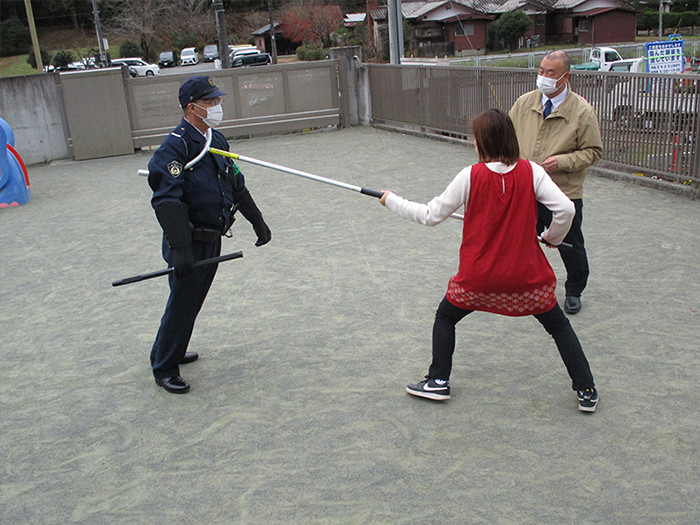 不審者対応訓練です。警察の方に来ていただき、さすまたの使い方を教えてもらいました。 。