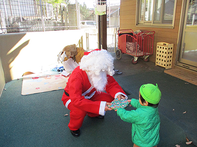 保育園にもサンタさんが来てくれました。小さいお友だちにも「はい、どーぞ!」喜んで受け取っていました。