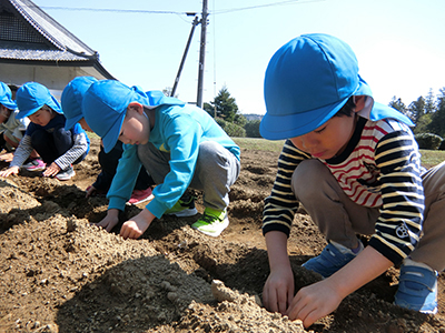 じゃがいもを置く向きなどを教えてもらい、土をかけトントントン!!大きくなあれ!みんなで言葉をかけてきました。