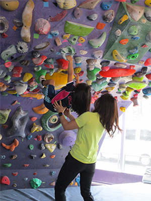 支えてもらい、そり返った壁もぶら下がってみました。やる気十分です。